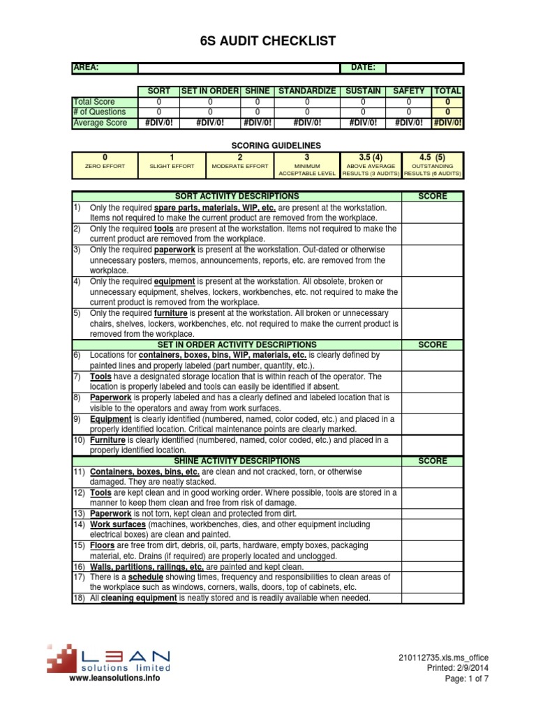 Browse the public library of over 100,000 free editable checklists for all industries. View and download manufacturing 6s audit for free. A 6s audit is basically a 5s audit with extra attention to safety. Conduct effective audits and inspections with the free checklist template of 6s audit checklist. Use this template periodically to inspect the quality and safety practices in.