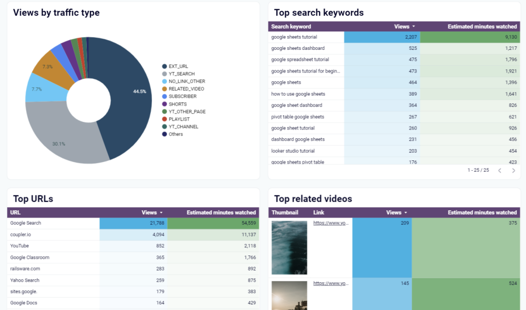 Get a free youtube dashboard template to analyze your video performance! Create a youtube data source with the google connector on looker studio. Get your free google data studio template. Save hours of work with our click and ready google data studio template. This template is free to get and free to use!