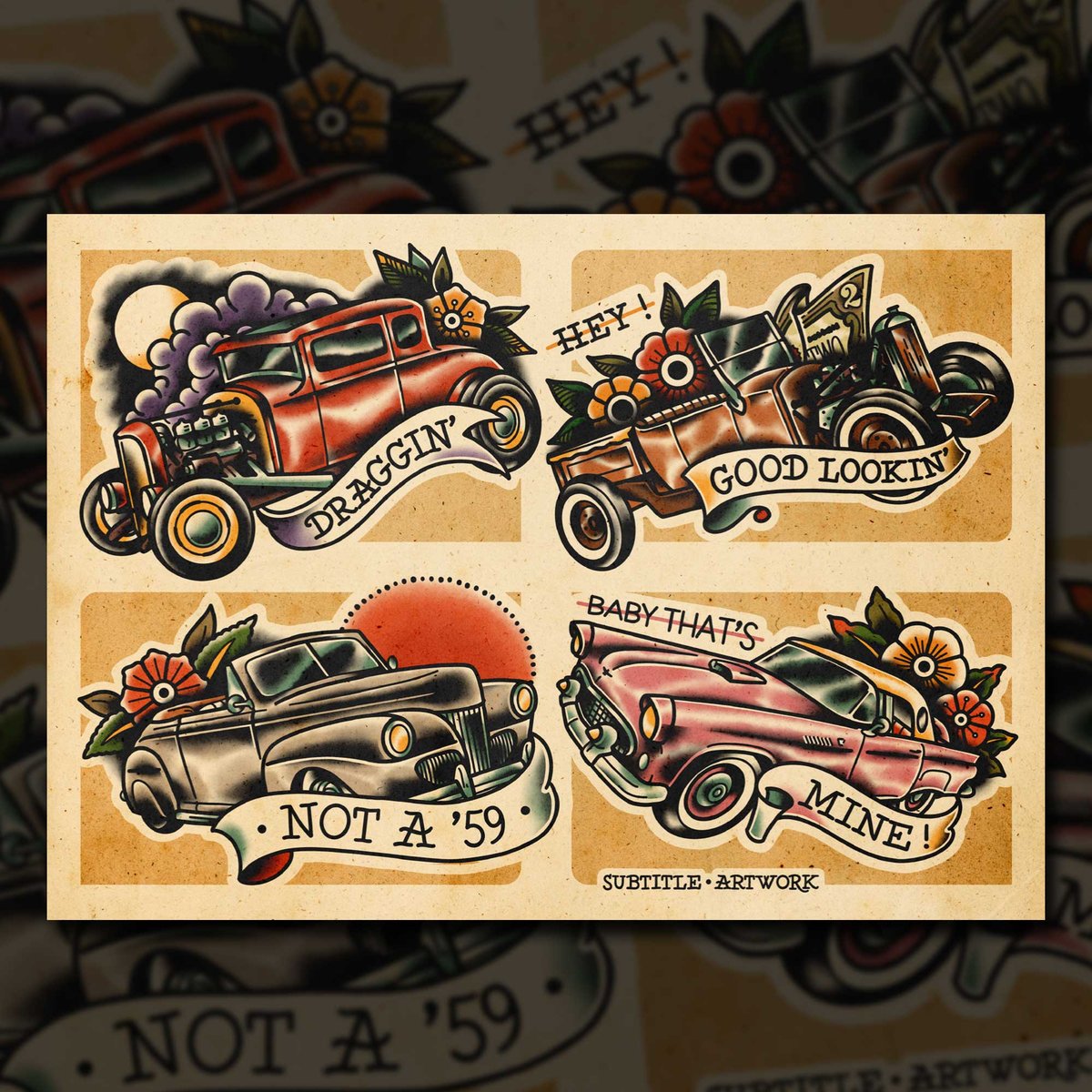 Rockabilly HotRods Tattoo Flash Print Subtitle Artwork