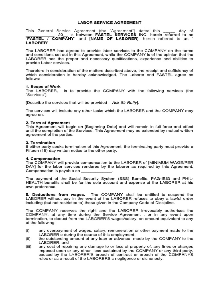 Labor Agreement Sample Master of Template Document