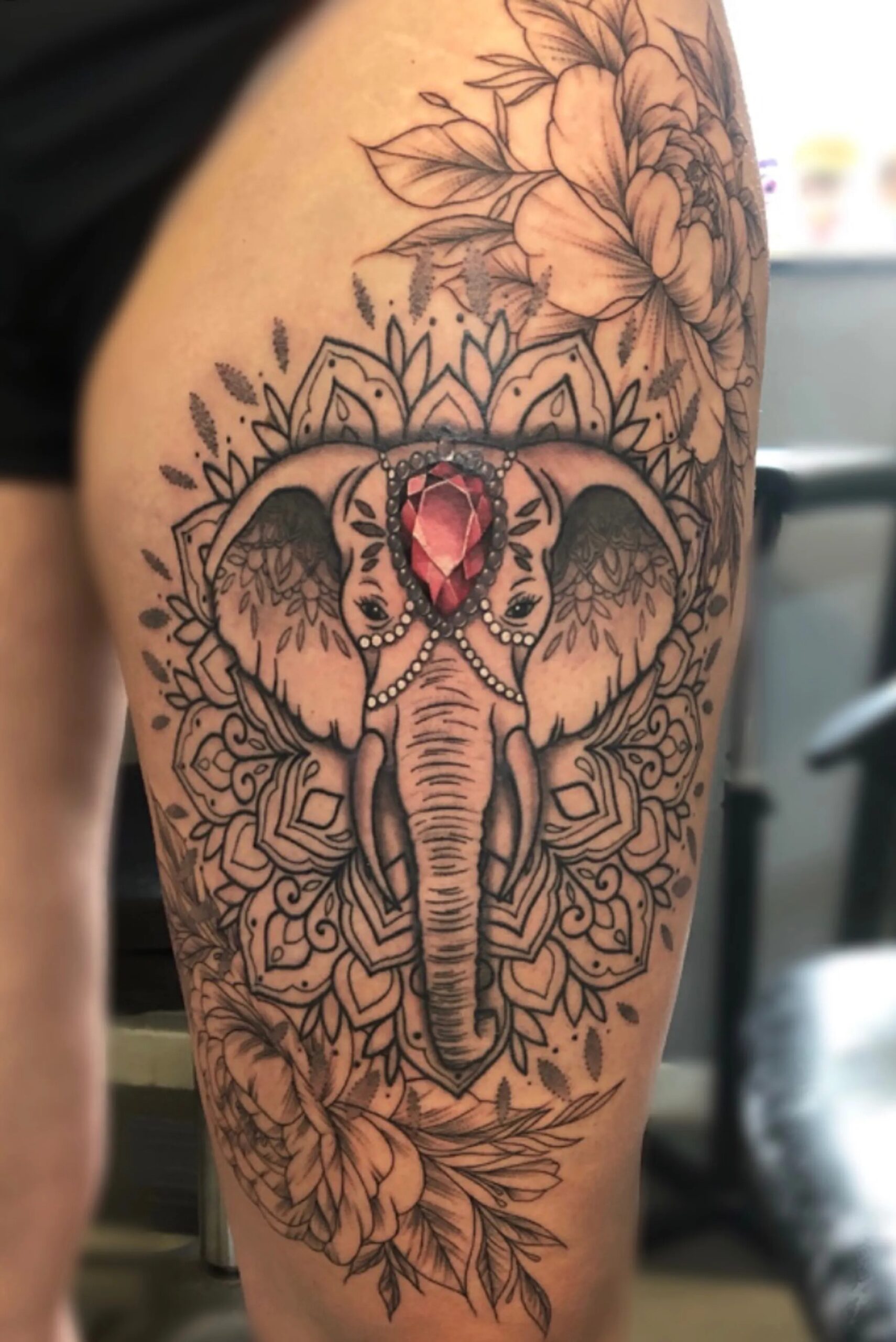 Elephant Mandala Thigh Tattoo