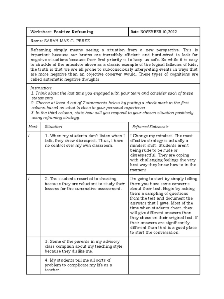 Please use this worksheet to practice reappraisal in relation to situations that aren’t going well or. Use the activity below to practice positive reframing. Practice reframing your thoughts as positive ones. If you reframe painful negative thoughts, you. Establish positive intentions or affirmations that align with the reframed thoughts and positive.