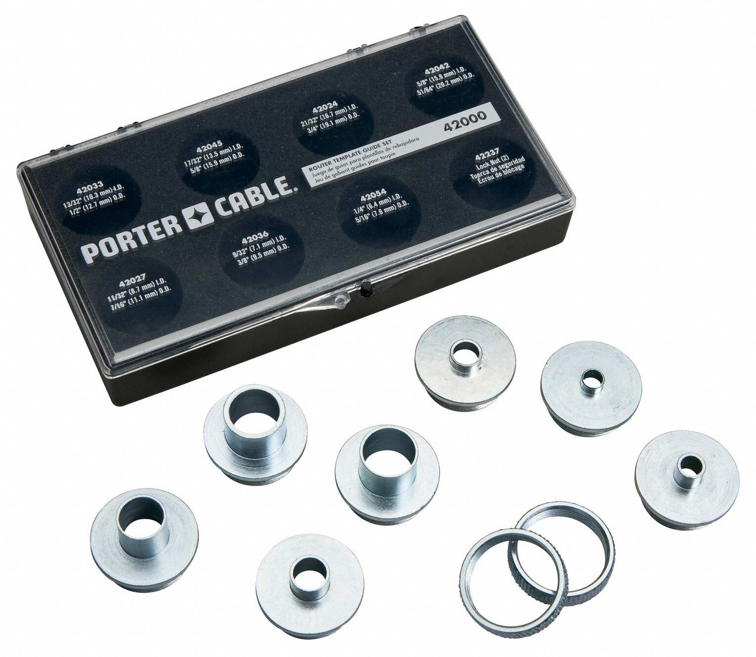 This kit is comprised of template guides 42027 to complement dovetailing applications; 42042 for hinge butt jigs; And general guides 42024, 42033,.