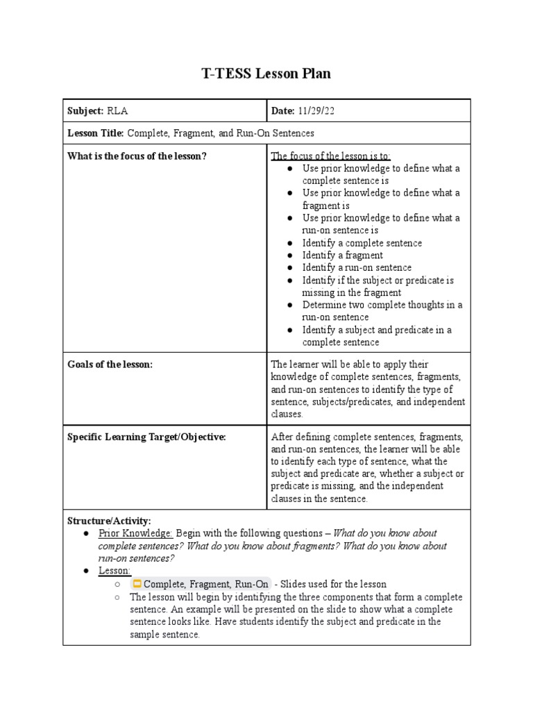 TTess Lesson Plan 2223 PDF Subject (Grammar) Sentence (Linguistics)