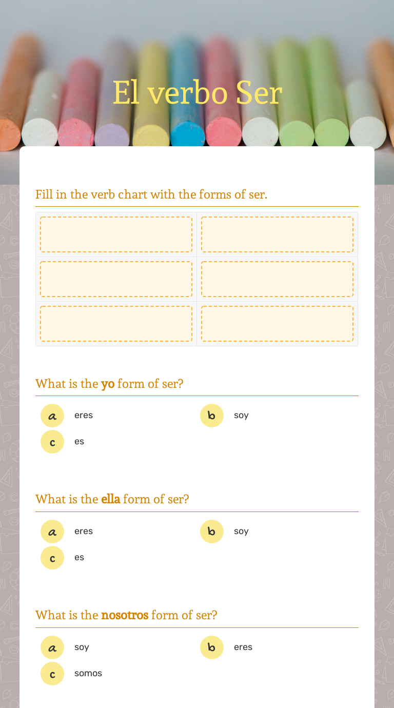 Use a form of the verb ser to write these sentences in spanish. Use the words from the word bank to. Practica el verbo ser forma oraciones con una palabra de cada columna como en el ejemplo. El verbo ser completa las frases con la conjugación correcta del verbo ser. Difference between the spanish verbs ser and estar to beginner students.