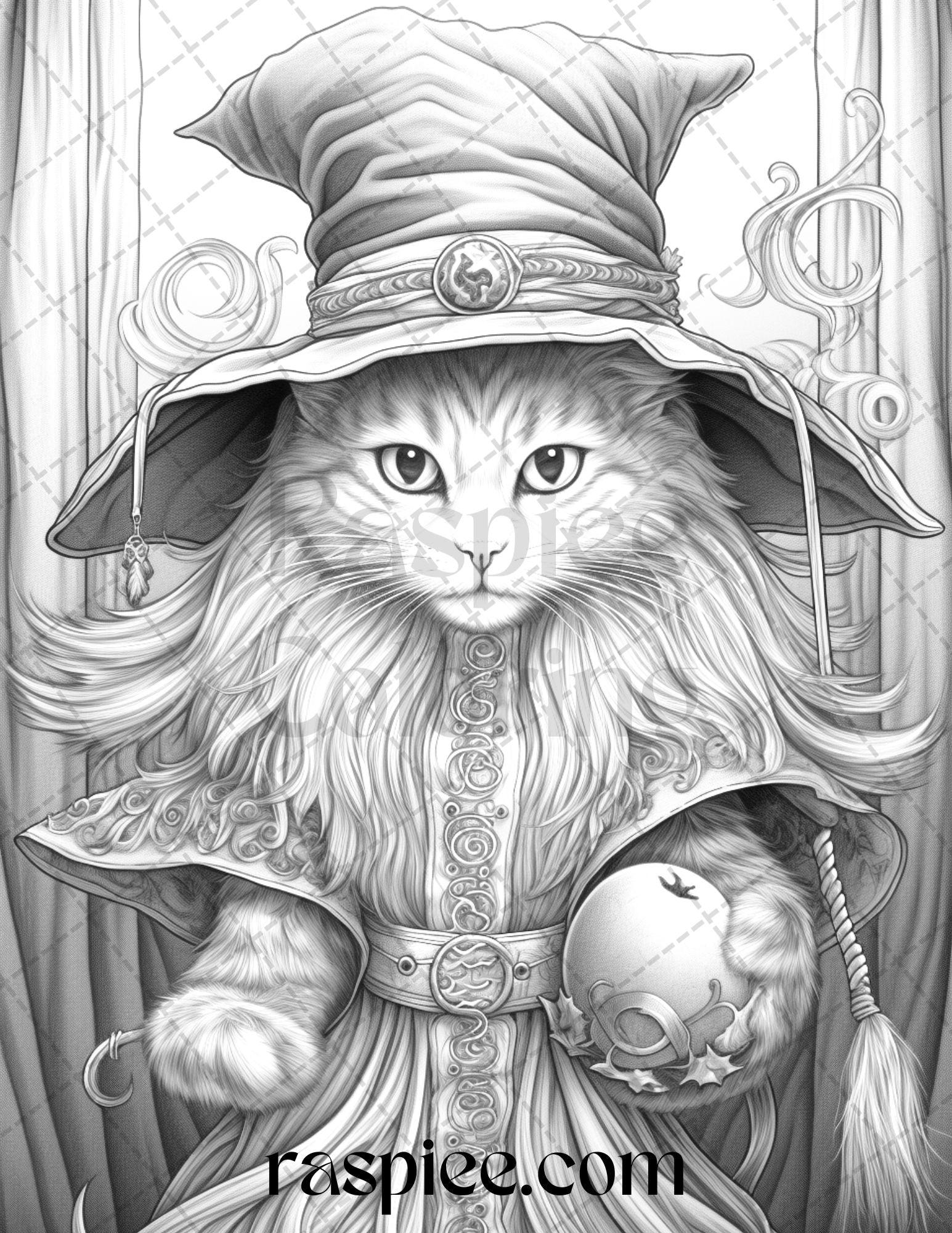 40 Halloween Witch Cat Grayscale Coloring Pages Printable for Adults,